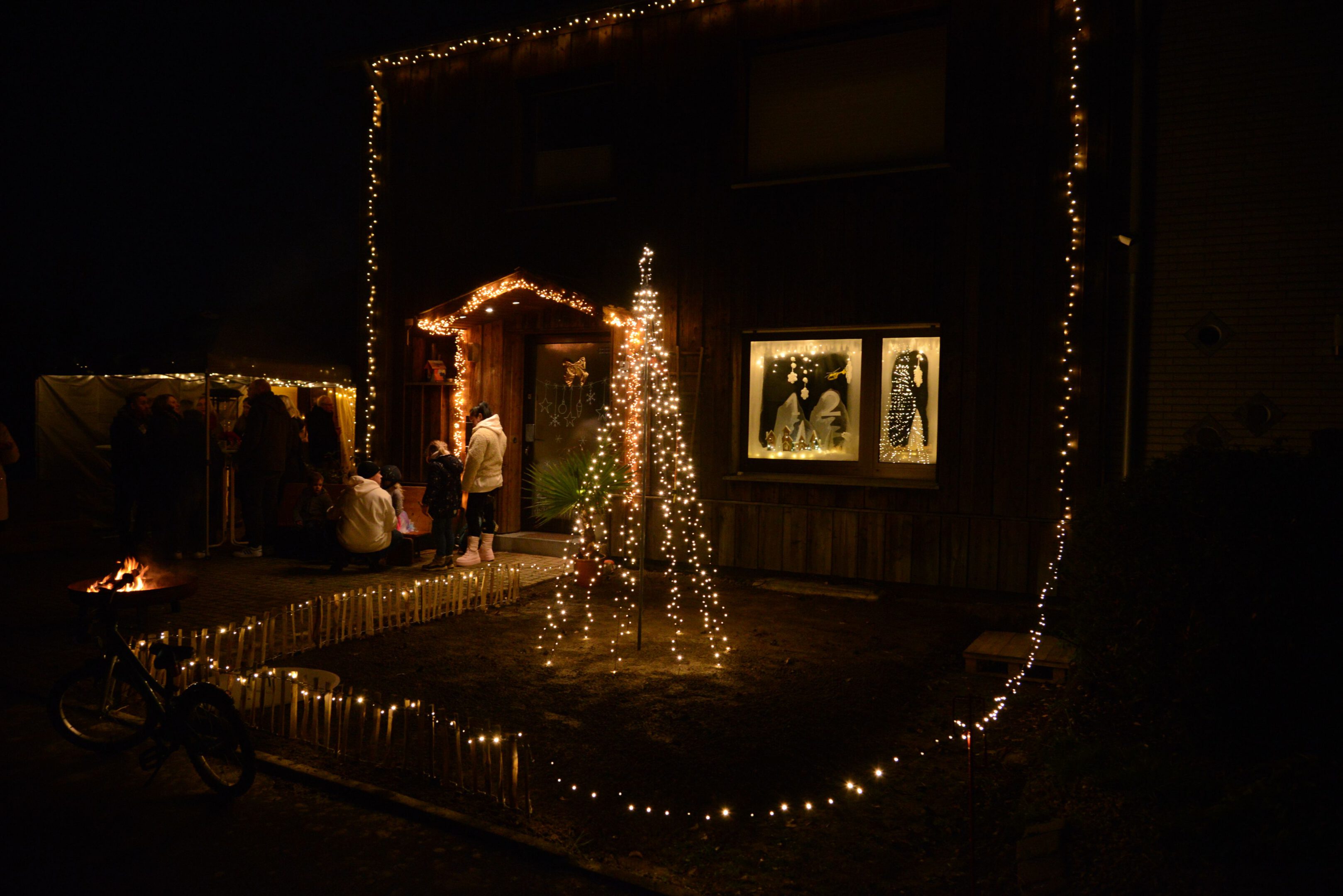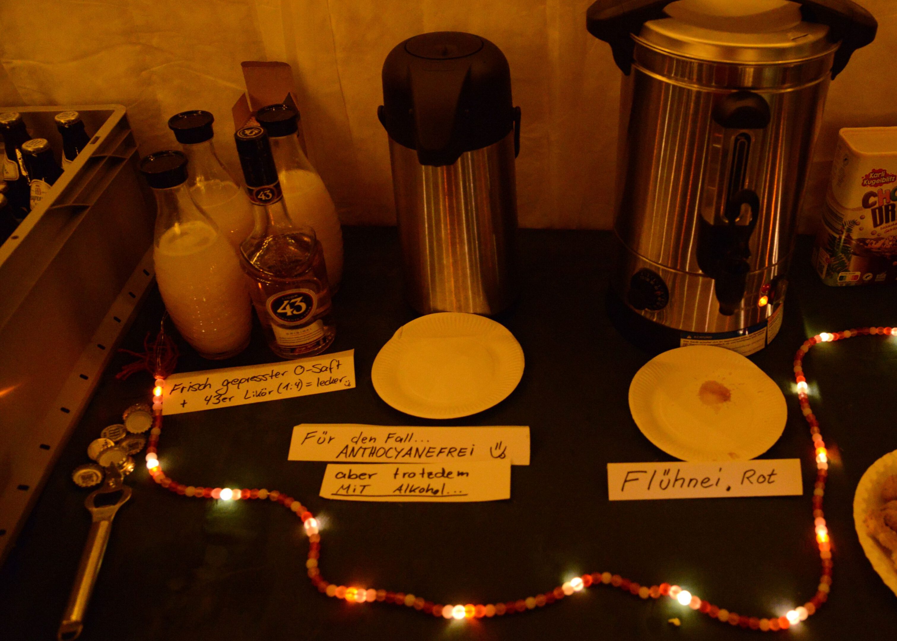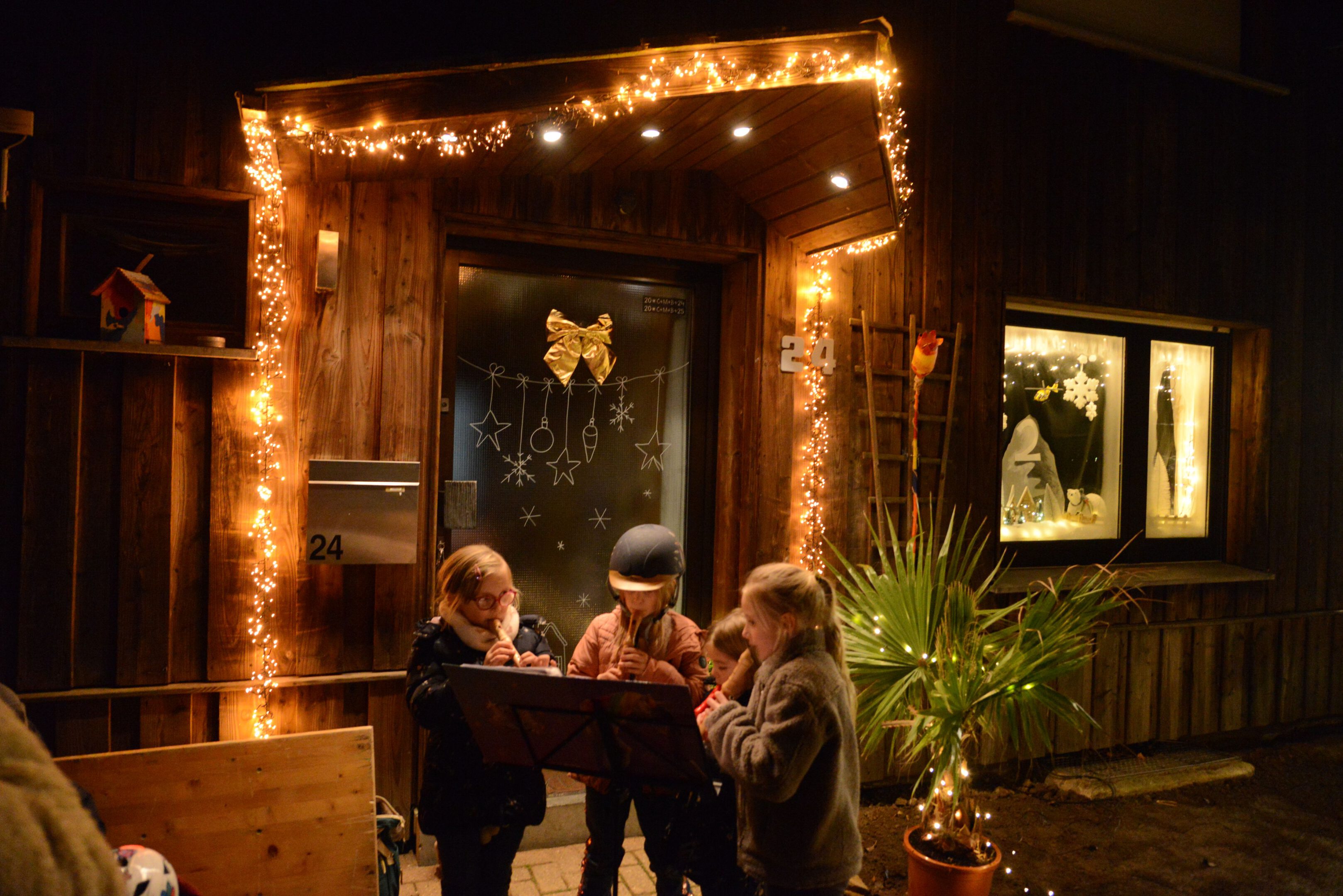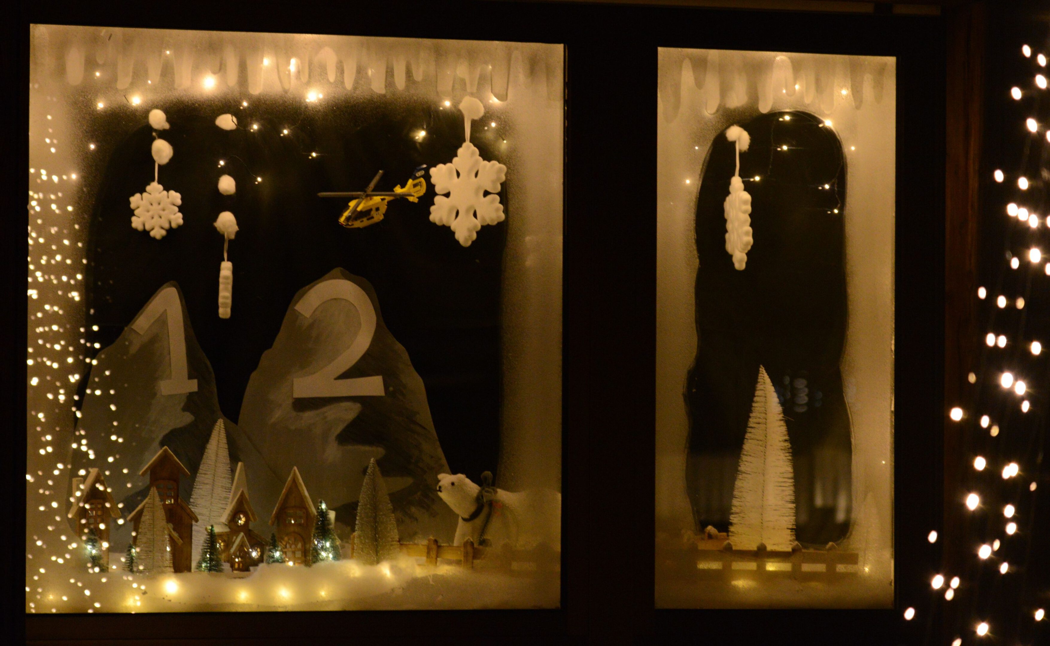 Da war dann doch eher Dezemberwetter angesagt – mit Glühwein (rot und auch ohne rote Anthocyane, somit weiß) statt Swimmingpool im Vorgarten. Beim Bier konnten sich nicht nur fränkisch-bayerische Kehlen am Bayreuther Bier erfreuen. Es gab auch Blasmusik (natürlich weihnachtlich) von der freundlichen Nachbarschaft (Dankschön!) und den jungen Flötenspielerinnen (Danke, Josée!). Das winterliche Adventsfenster war Teil des Gesamtkunstwerks des Hauses mit dem zwölf-gespitztem Alpenpanorama, dem Merzbrücker Rettungshubschrauber (Arbeitsplatz eines der Hausbewohner) und einem Eisbären. Sehr schön!