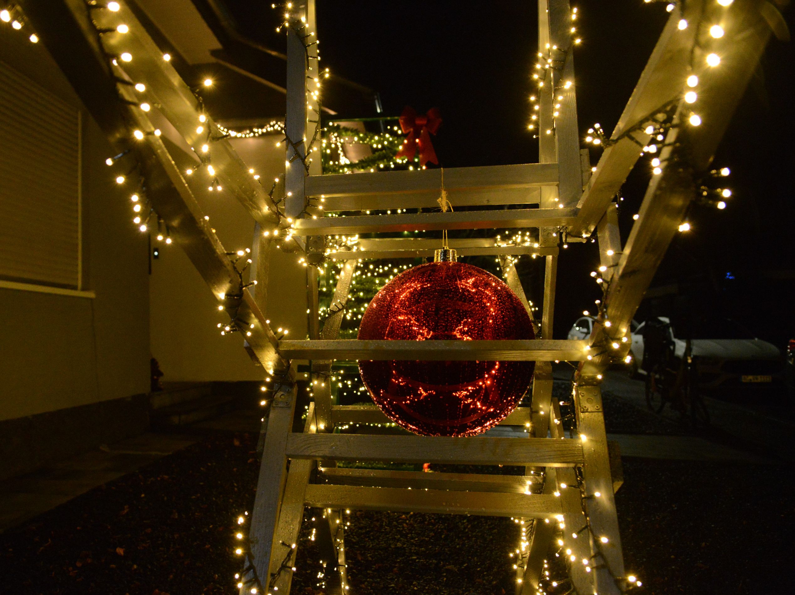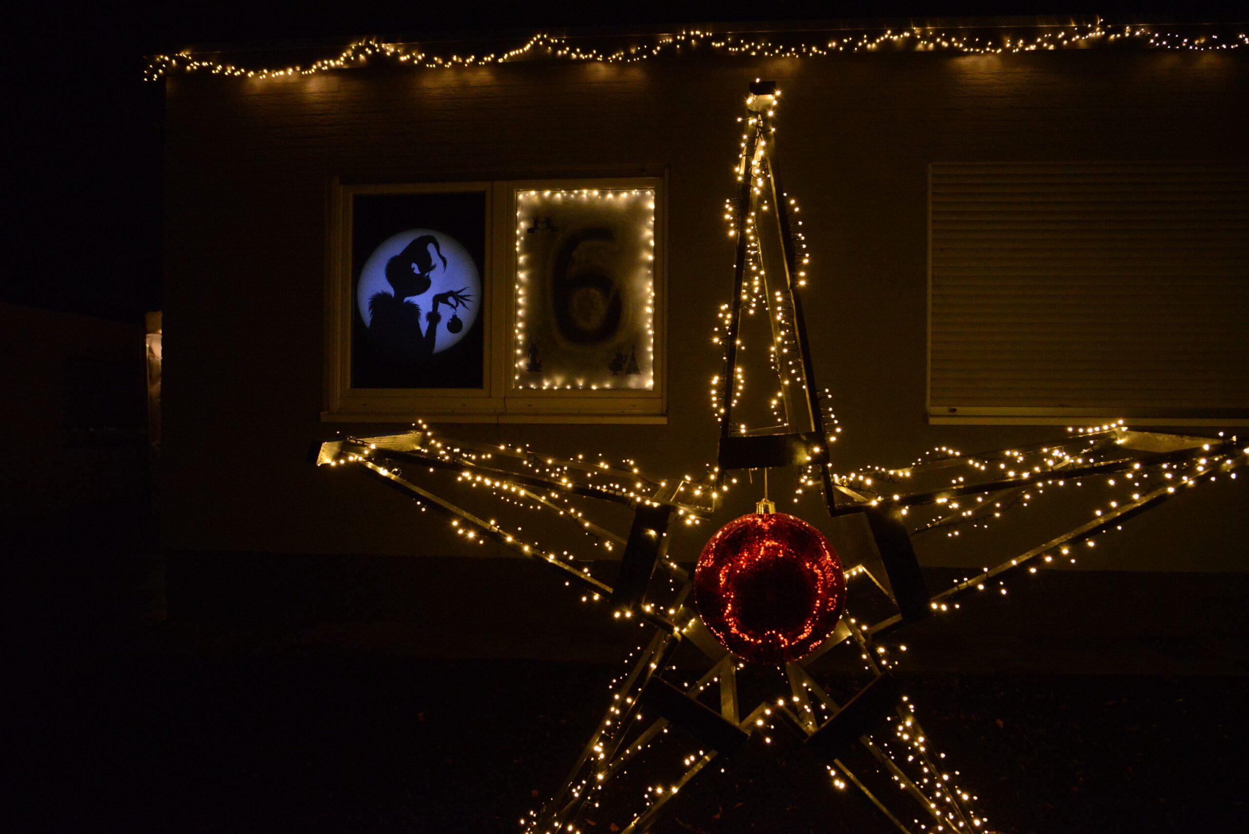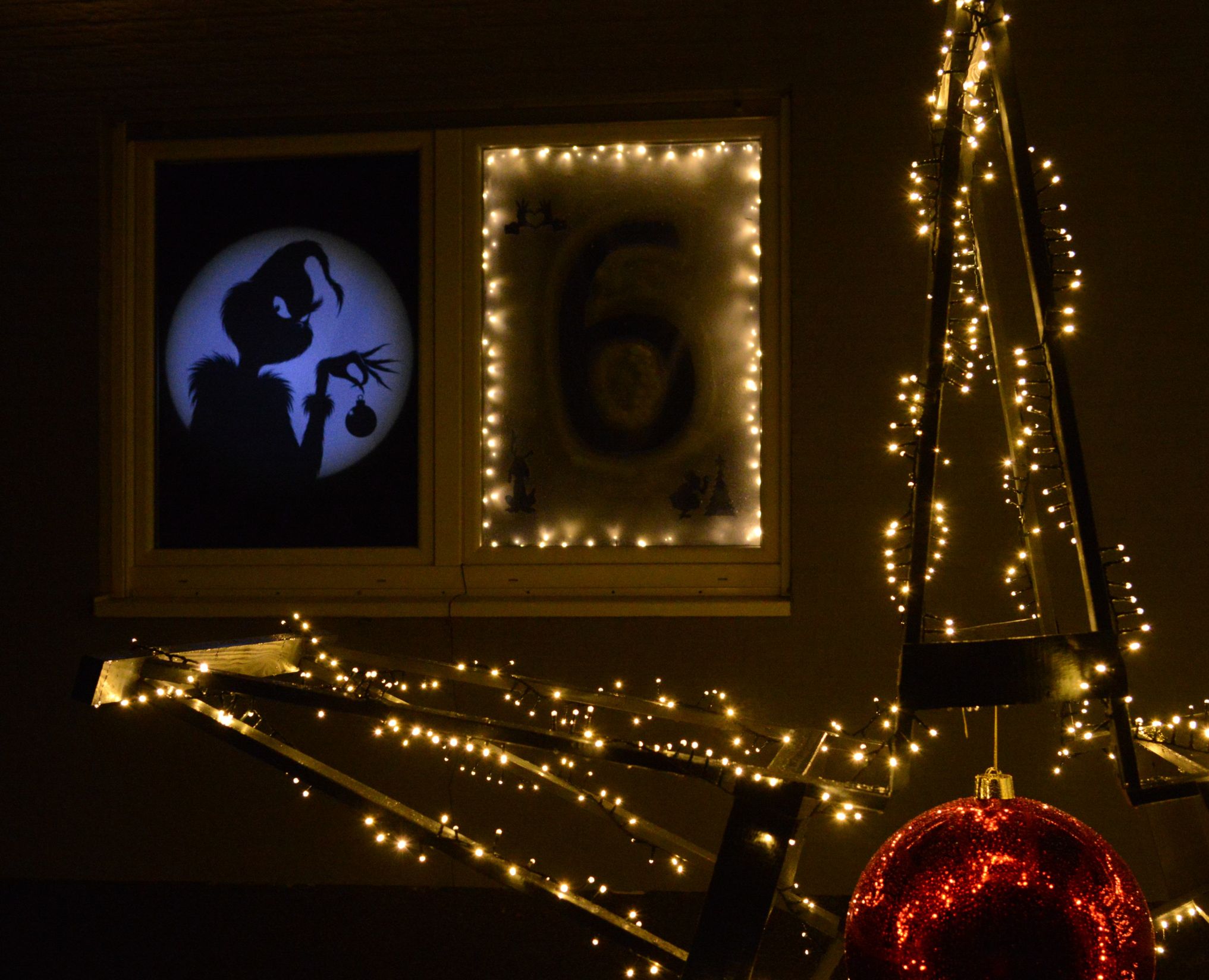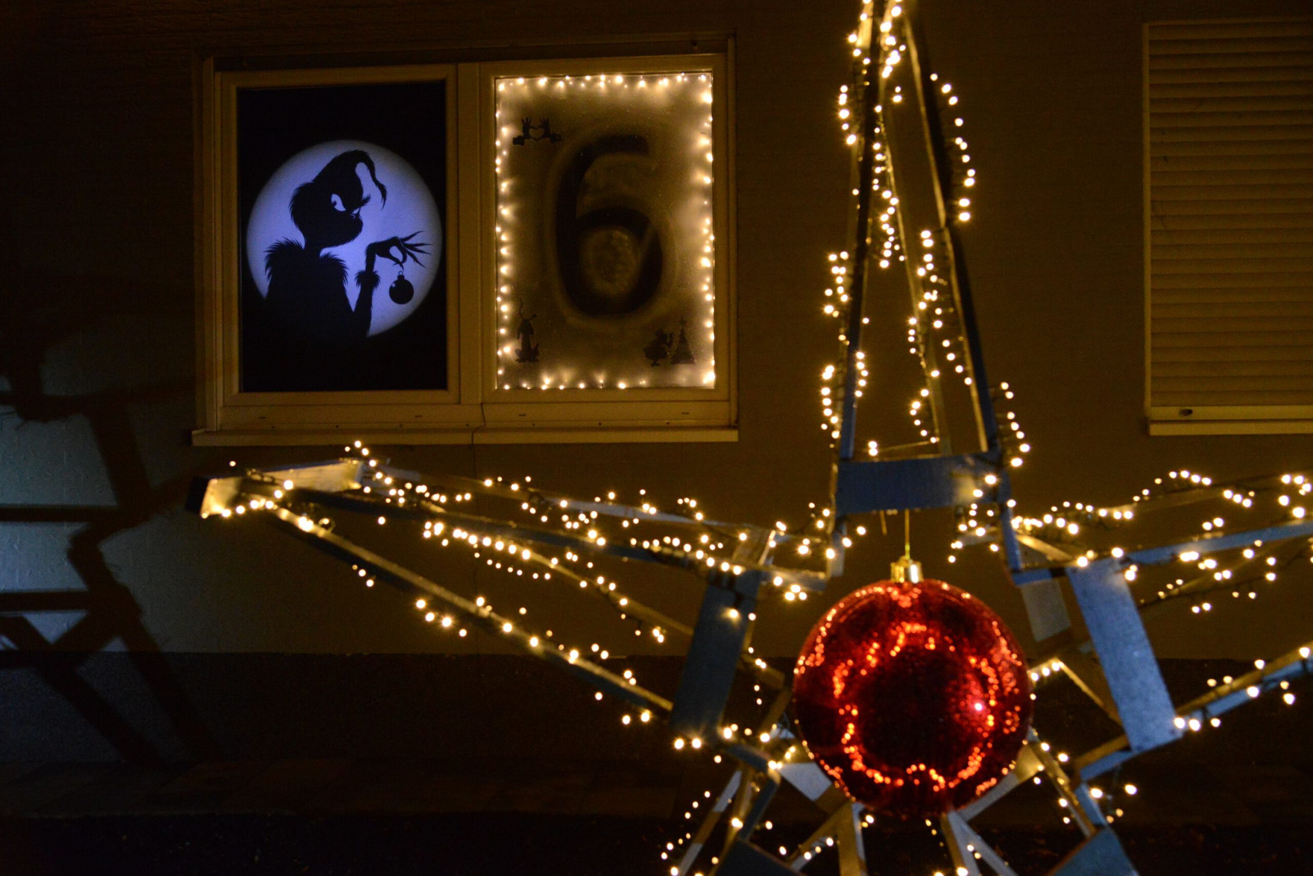 Vielleicht hat das Mädchen auf dem Bild dem Grinch beigebracht, dass Weihnachten mehr ist als Online-Bestellungen und große Geschenke. Auf jeden Fall hatten heute trotz des zeitweiligen Regens viele Menschen Lust auf ein nettes Gespräch bei einer beeindruckenden Getränkeauswahl. Garage und Zelt hielten die Besucher trocken. Dafür zauberten die Tropfen noch mehr Reflexionen auf die beeindruckend große Weihnachtskugel. Es war eine sehr schöne Zusammenstellung von Fenster und liebevoll lackierten und gestalteten Holzböcken. Ein großes Kompliment an die heutigen Gastgeber – auch vom Fotografen, der immer Spaß an Strukturen und Spiegelungen hat.