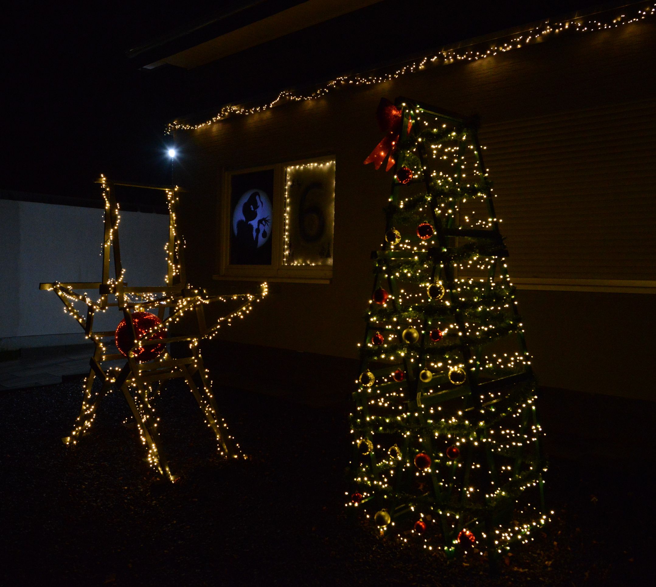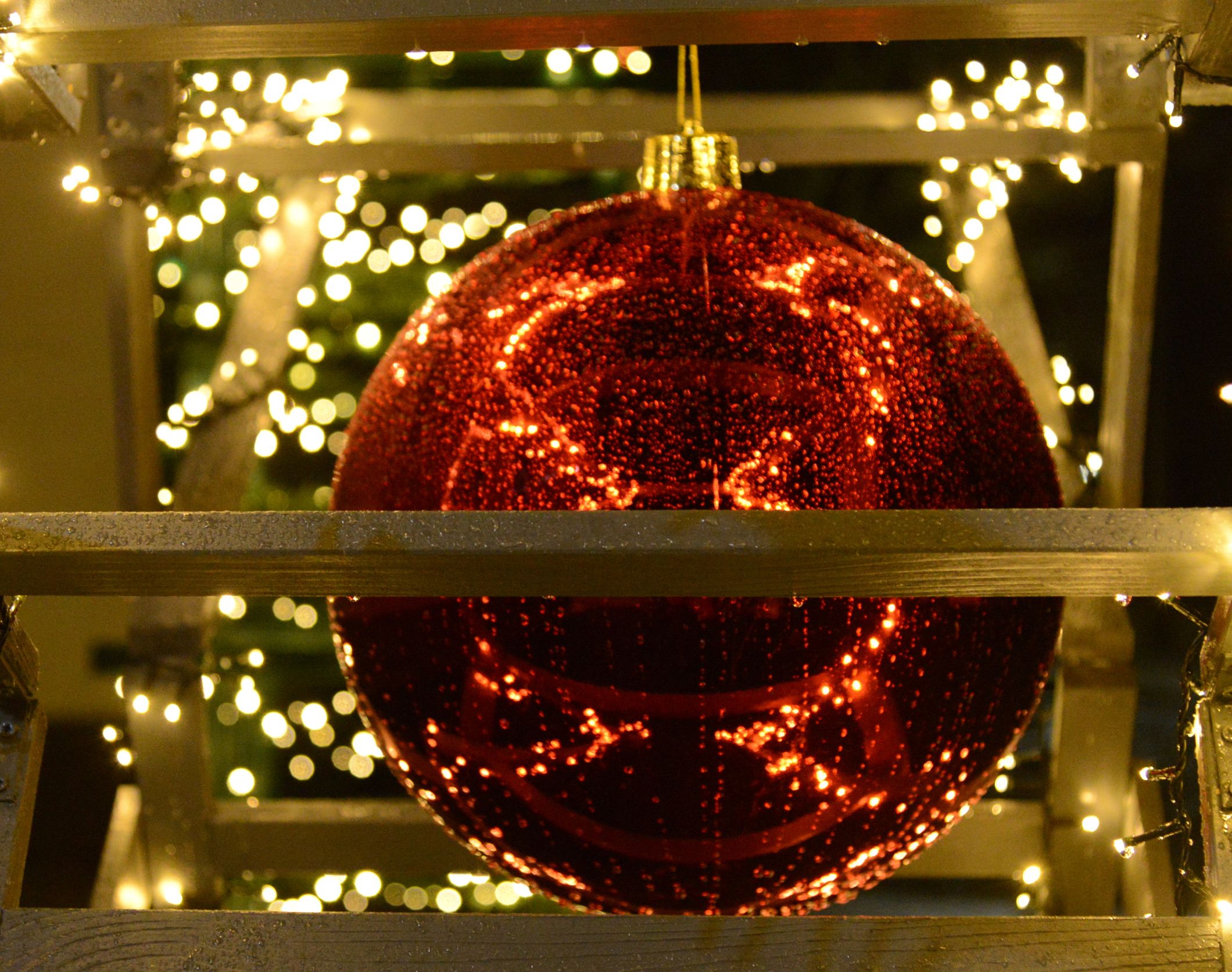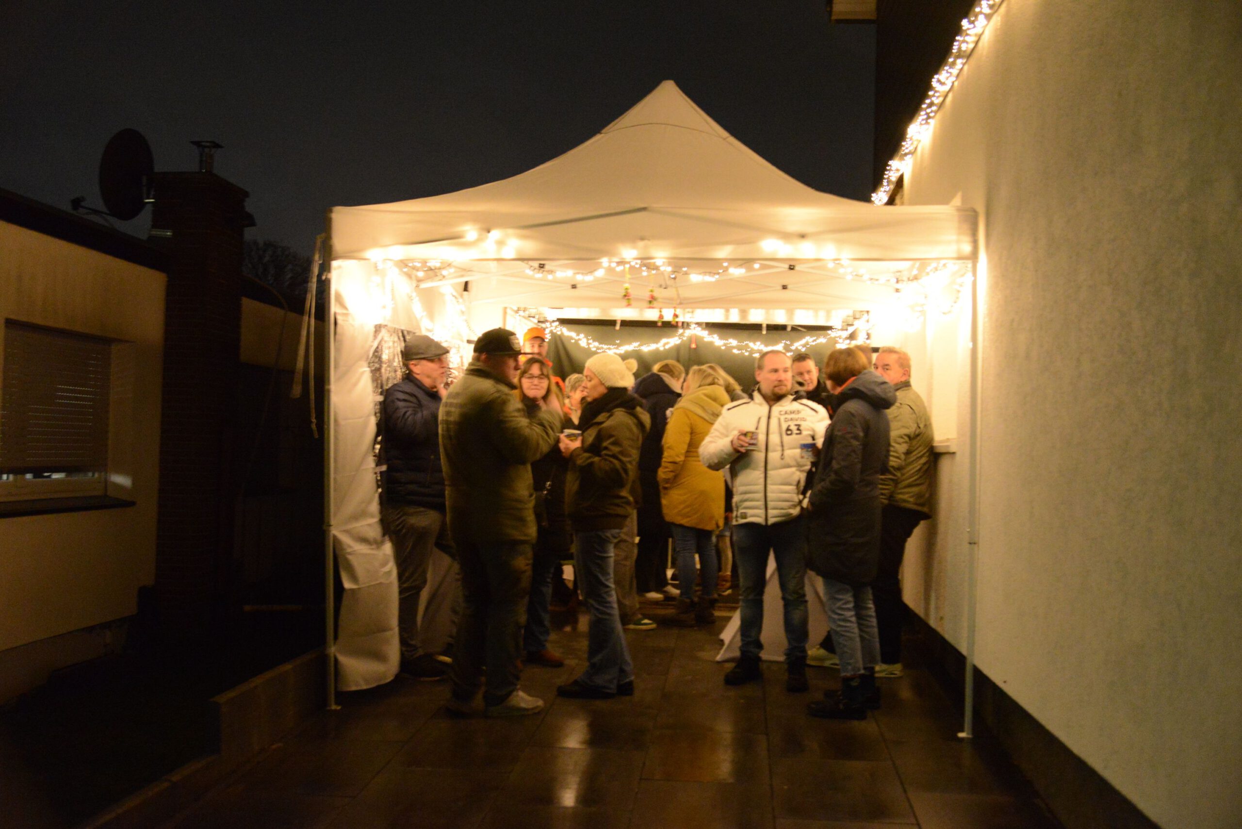 Vielleicht hat das Mädchen auf dem Bild dem Grinch beigebracht, dass Weihnachten mehr ist als Online-Bestellungen und große Geschenke. Auf jeden Fall hatten heute trotz des zeitweiligen Regens viele Menschen Lust auf ein nettes Gespräch bei einer beeindruckenden Getränkeauswahl. Garage und Zelt hielten die Besucher trocken. Dafür zauberten die Tropfen noch mehr Reflexionen auf die beeindruckend große Weihnachtskugel. Es war eine sehr schöne Zusammenstellung von Fenster und liebevoll lackierten und gestalteten Holzböcken. Ein großes Kompliment an die heutigen Gastgeber – auch vom Fotografen, der immer Spaß an Strukturen und Spiegelungen hat.