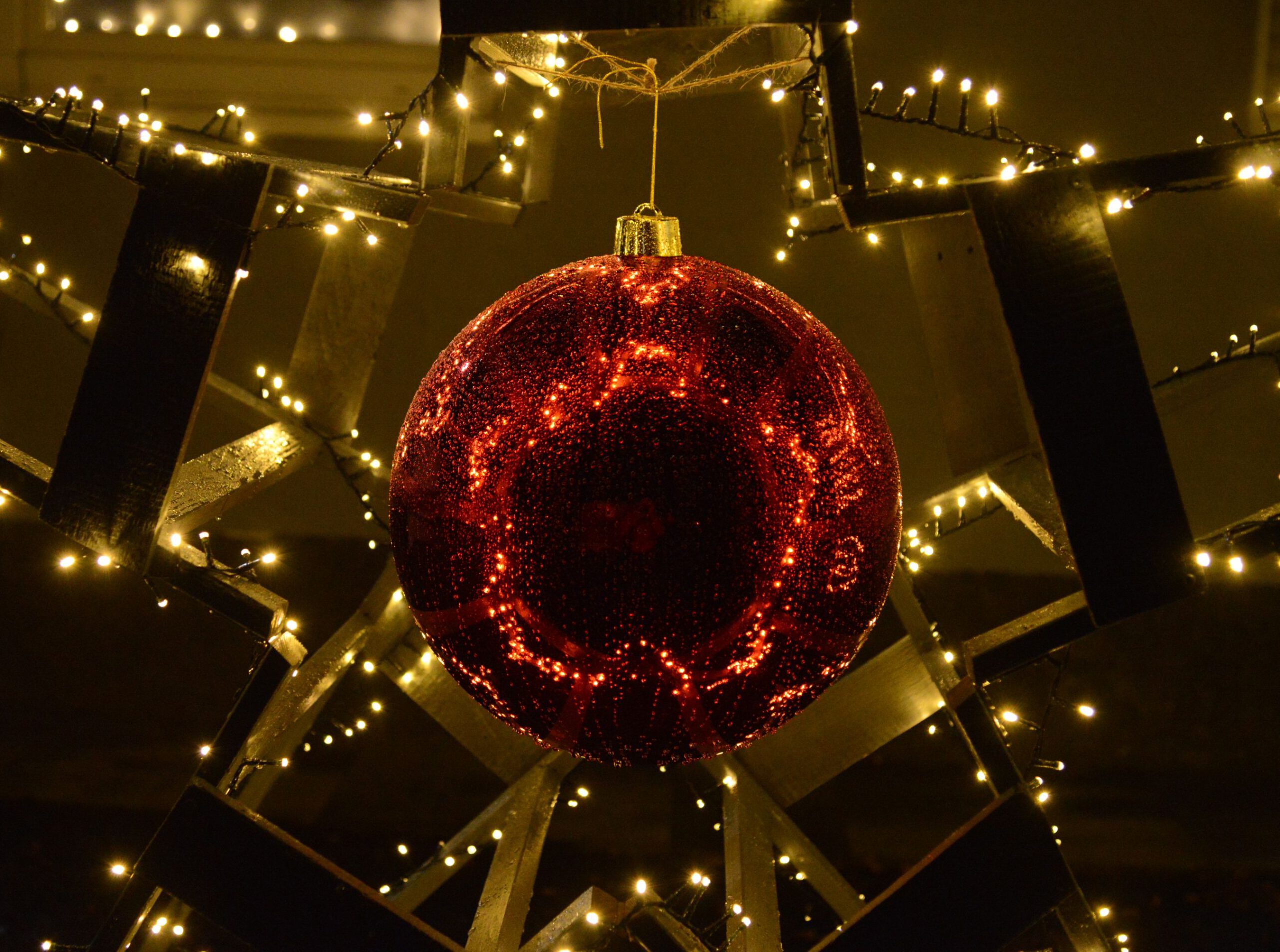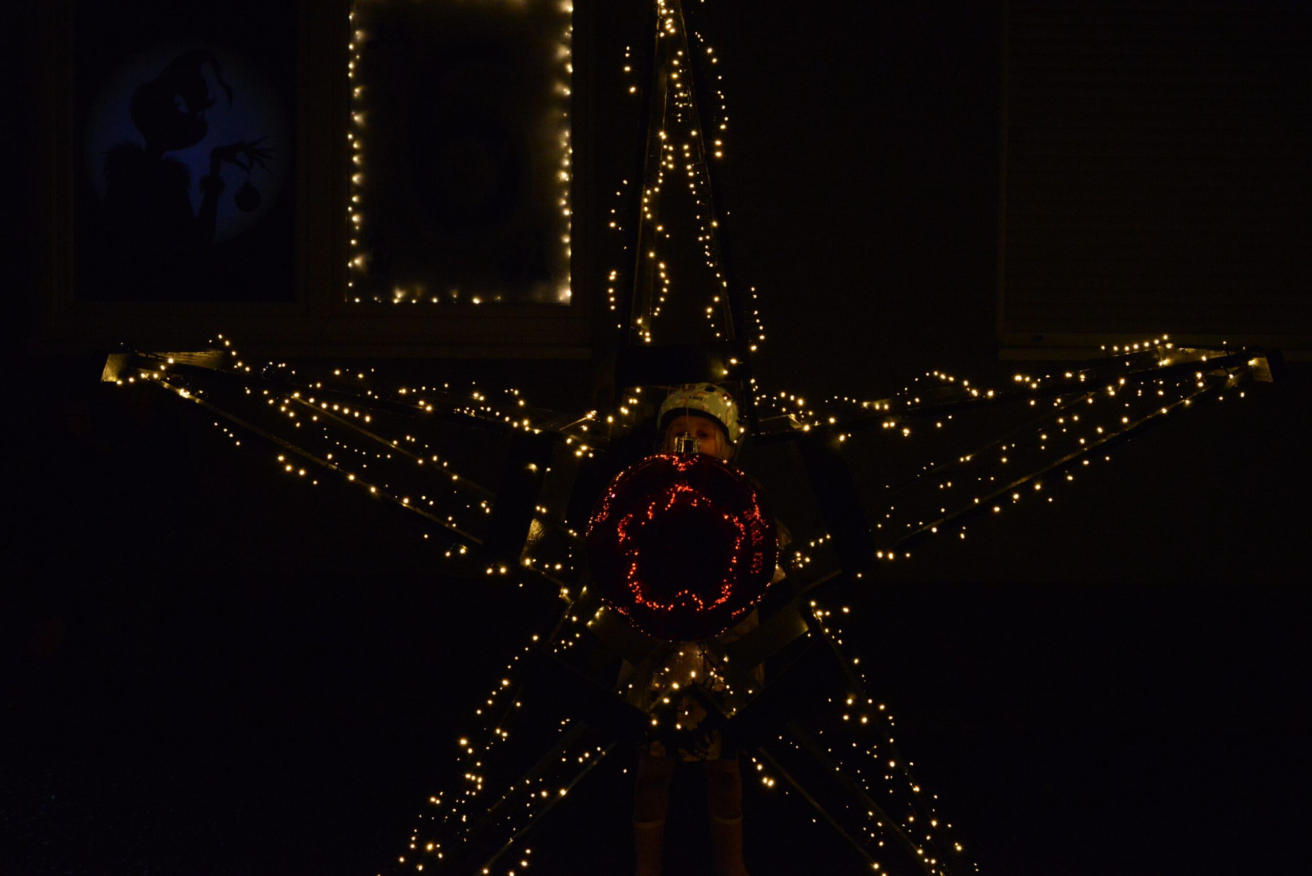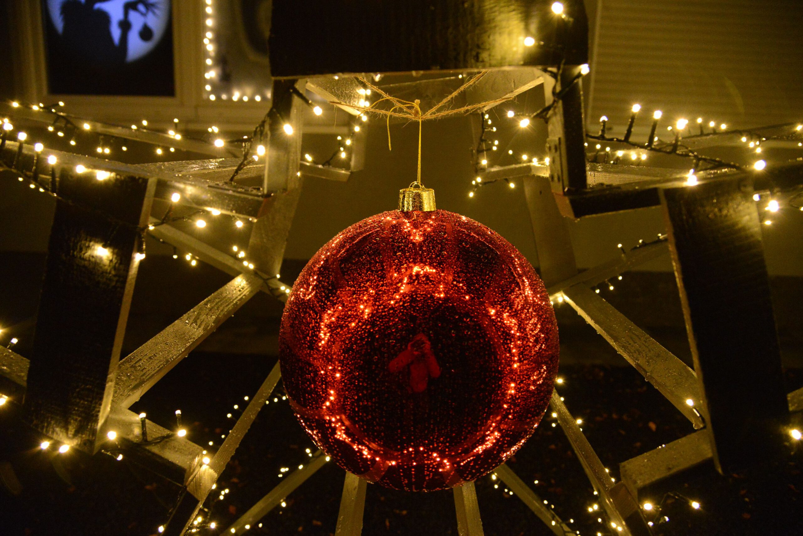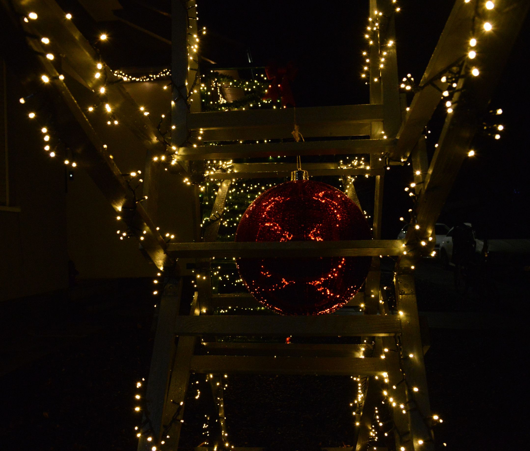 Vielleicht hat das Mädchen auf dem Bild dem Grinch beigebracht, dass Weihnachten mehr ist als Online-Bestellungen und große Geschenke. Auf jeden Fall hatten heute trotz des zeitweiligen Regens viele Menschen Lust auf ein nettes Gespräch bei einer beeindruckenden Getränkeauswahl. Garage und Zelt hielten die Besucher trocken. Dafür zauberten die Tropfen noch mehr Reflexionen auf die beeindruckend große Weihnachtskugel. Es war eine sehr schöne Zusammenstellung von Fenster und liebevoll lackierten und gestalteten Holzböcken. Ein großes Kompliment an die heutigen Gastgeber – auch vom Fotografen, der immer Spaß an Strukturen und Spiegelungen hat.