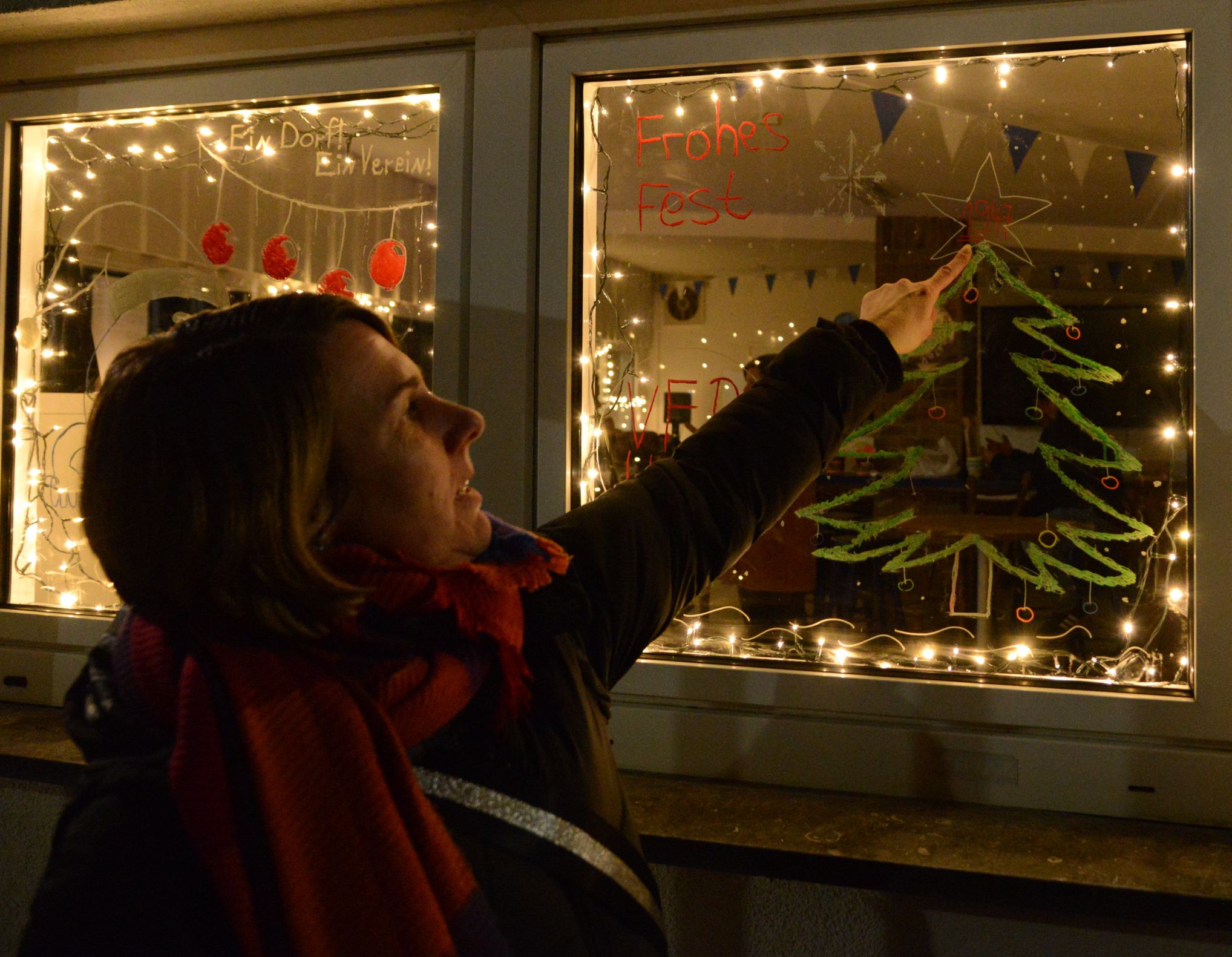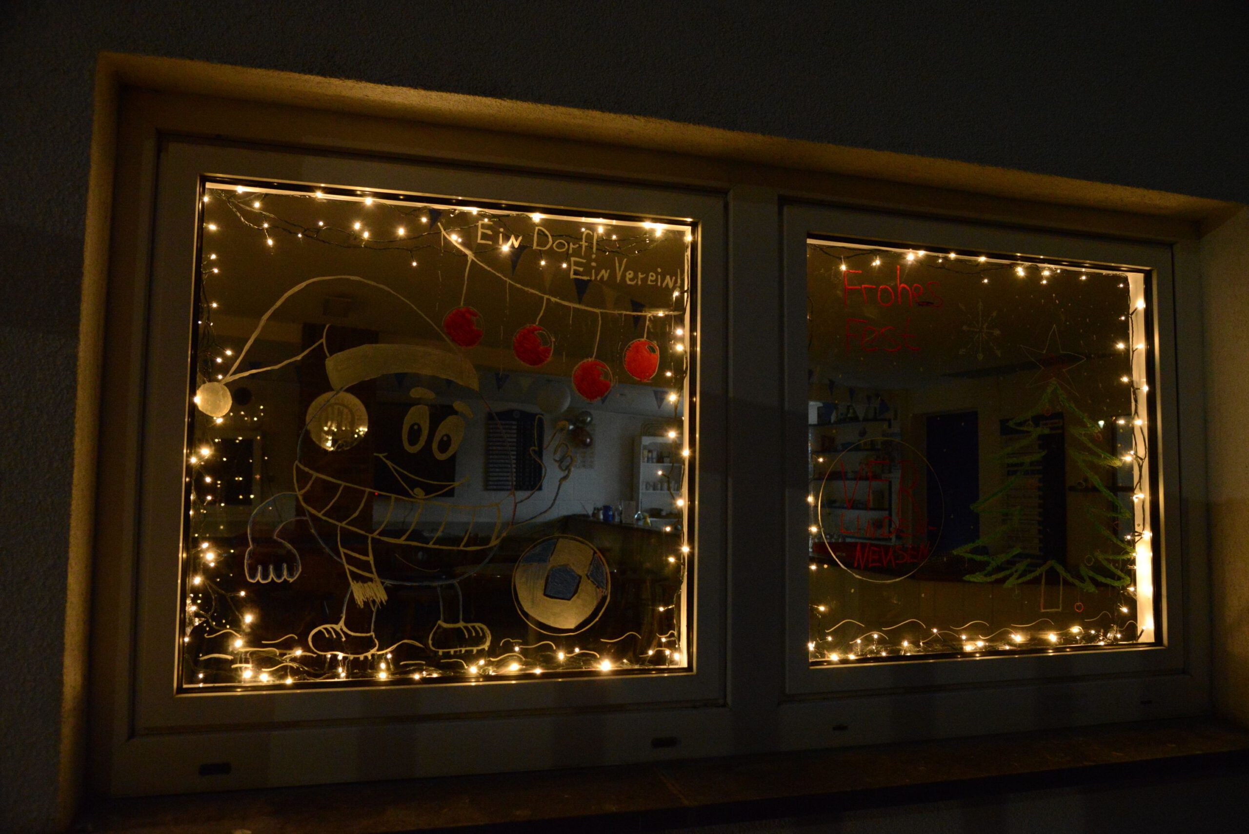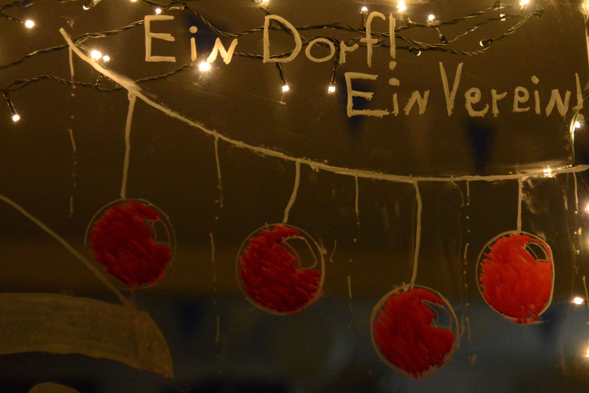 Die Farben des Adventsfensters 1.0 waren es nicht. Nach getaner Arbeit und weiterer Gemütlichkeit in der Ballerbude flossen sie mit dem Kondenswasser wieder herunter. Also Nachspielzeit und neu malen. Das 2:0 konnte dann siegreich gefeiert werden, allerdings nicht in der für das Dorf so wichtigen Ballerbude, sondern draußen. Für diese werden wir bei der Schulerweiterung einen guten Ersatz brauchen. Und für das gemeinschaftliche Dorfleben brauchen wir einen Aufstieg in die nächste Willkommens-Liga, damit es so schön bleibt wie bisher. Der Fußball wird uns dabei hoffentlich sehr helfen, viele Menschen am Dorf weiter teilhaben zu lassen und sie zum aktiven Mitmachen bei Spiel, Spaß und gemeinschaftlichem Engagement zu aktivieren. Wie auf dem Platz: Manche schwitzen, viele haben Spaß, aber nichts geht, wenn sich nicht einige immer (am besten abwechselnd) im Hintergrund und an der Seitenlinie engagieren (hier: Malen, Glühweinversorgung, Ausschank …). Wer weder Fußball spielen noch Trainer werden kann, lernt viele nette Menschen kennen, wenn er oder sie sich bei Vereins- und Dorfaktivitäten engagieren (sei es im Vorstand, am Grill oder hinter der Theke).