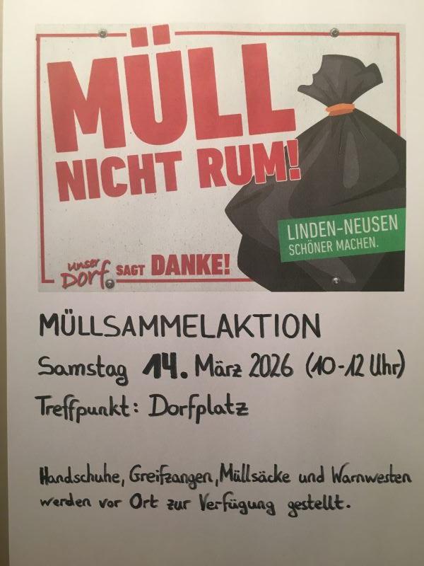 Linden-Neusen schöner machen. Bei der Müllsammelaktion sind wir wieder auf eine starke Gemeinschaftsleistung angewiesen. Packt mit an. Handschuhe, Greifzangen und Müllsäcke sowie Warnwesten werden vor Ort zur Verfügung